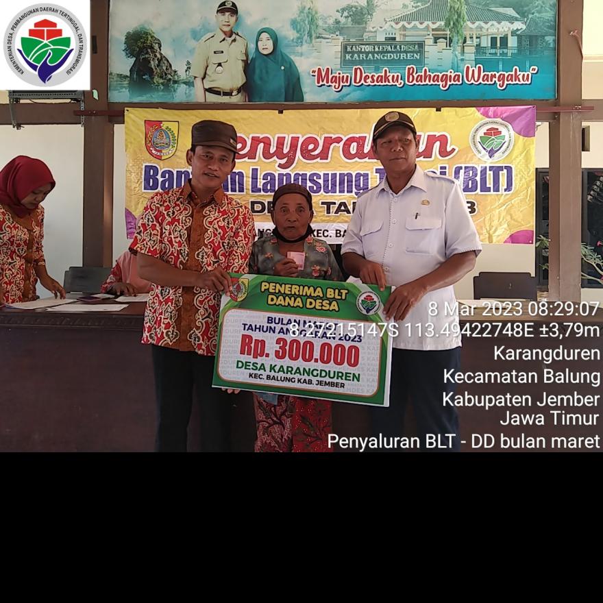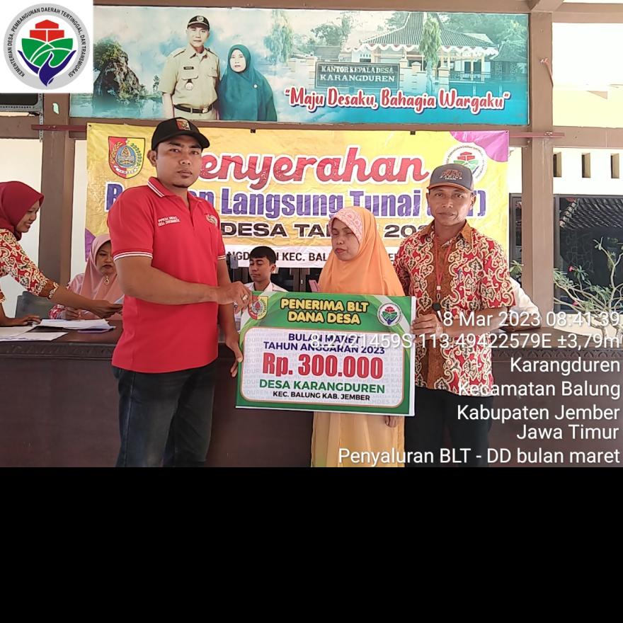Rabu,8 Maret 2023 bertempat di pendopo Kantor Desa Karangduren Kecamatan Balung dilaksanakan kegiatan Penyaluran bantuan Langsung Tunai (BLT - DD) bulan Ke - 3 (Maret). Bantuan ini di salurkan secara tunai ke 57 KPM. Di mana kegiatan ini juga di hadiri oleh BPD, Babinsa, Bhabinkamtibmas dan juga Pendamping Desa.Semoga bantuan ini bisa bermanfaat.