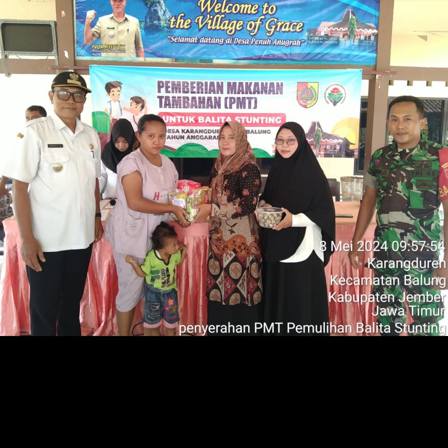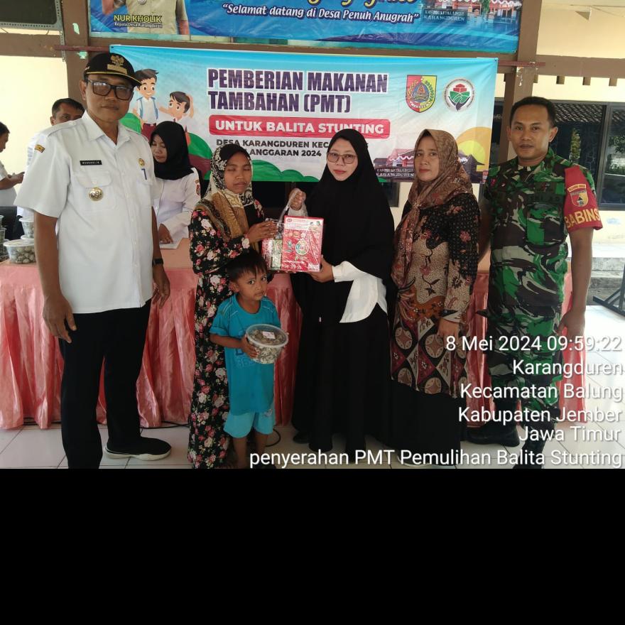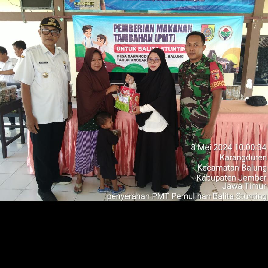 8 Mei 2024, telah di laksanakan kegiatan rutin yang sudah 2 tahun berturut-turut di laksanakan di desa karangduren yaitu Pemberian Makanan Tambahan (PMT) Pemulihan untuk Balita Stunting & Bumil KEK yang bertempat di pendopo desa karangduren. Di mana pad kesempatan kali d salurkan pada 41 balita Stunting dan 7 Ibu Hamil Kek yang di hadiri oleh Bapak kades, ketua. TPPS, bidan desa, pendamping desa & babinsa karangduren.Paket PMT ini berisi susu, telur, kacang hijau & biskuit.