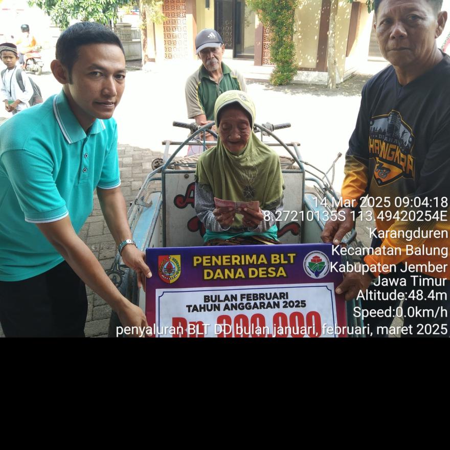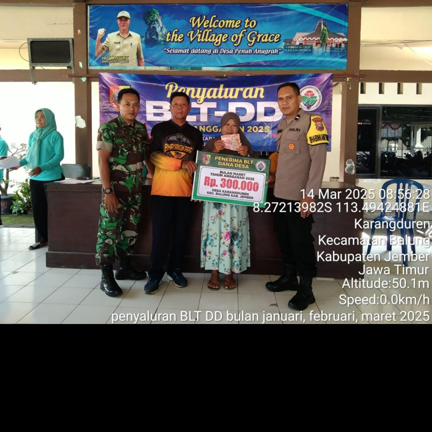 Pada bulan Maret tahun 2025 ini desa karangduren kecamatan balung telah menyalurkan BLT-DD di 36 KPM (Keluarga penerima Manfaat) di mana para KPM ini terdiri dari Keluarga Miskin ekstrim, lansia tunggal miskin, dan juga janda tua miskin dengan nominal Rp. 300.000,00 per bulan. penyaluran pada kali ini di salurkan langsung selama 3 bulan yaitu untuk bulan januari - Februari - Maret. penyaluran di hadiri oleh BPD, Babinsa, babhinkamtibmas dan juga Perwakilan dari Kecamatan Balung. acara berjalan lancar dan semoga bantuan lansung tunai ini bermanfaat untuk semua keluarga Penerima Manfaat.